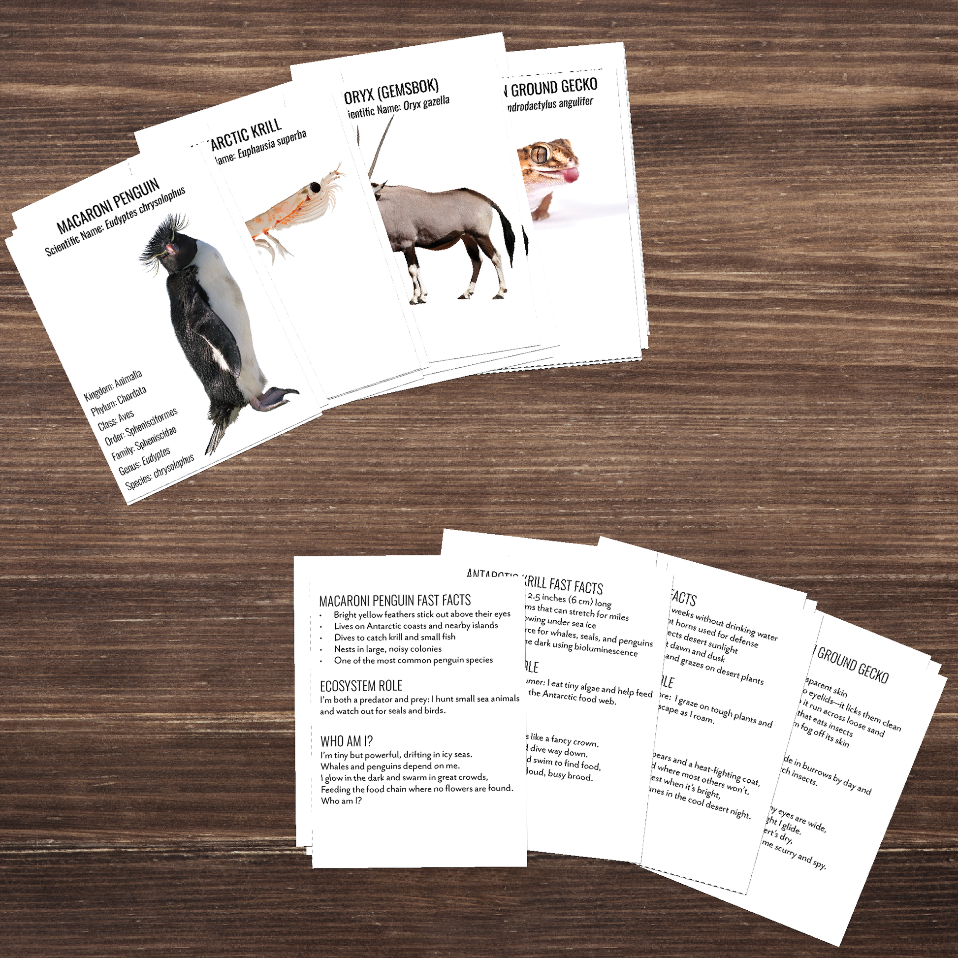 Flashcards feature animal names, scientific names, ecosystem roles, and memory prompts